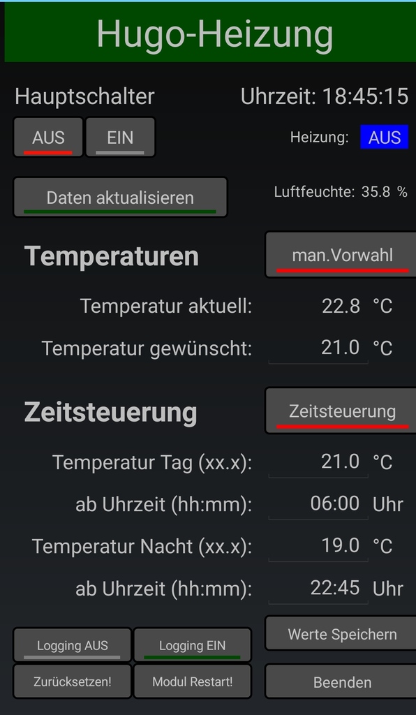 - 1. Im ausgeschalteten Zustand läuft die Heizung ganz normal wie immer.