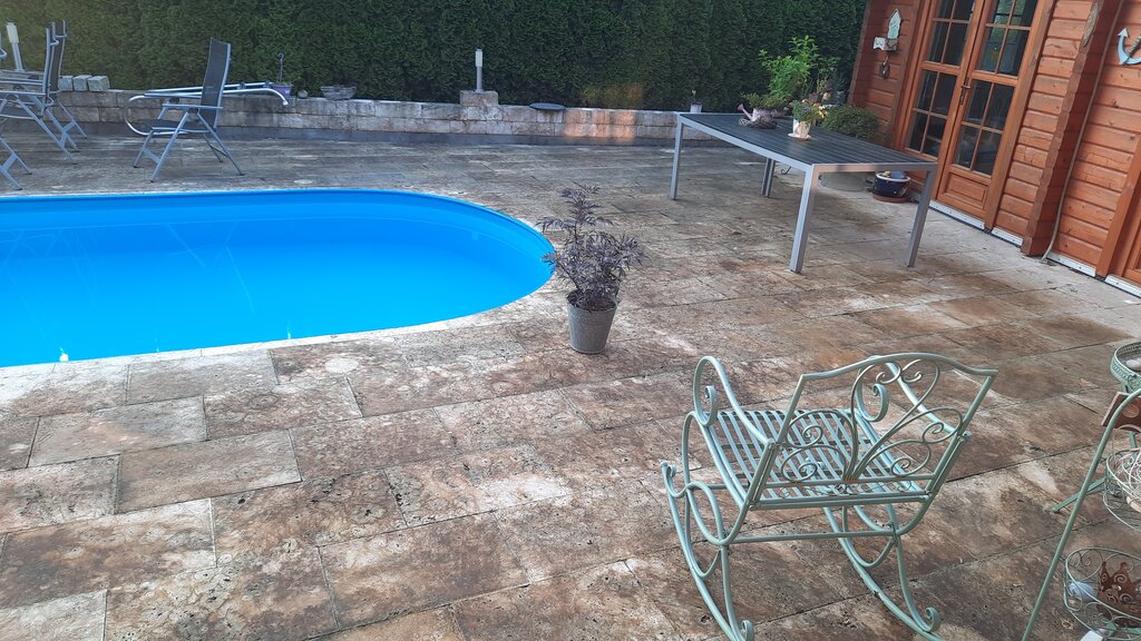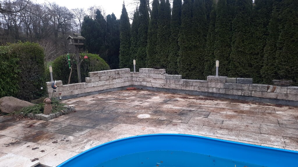 bei uns liegt im Aussenbereich ein Naturstein "Travertin", der durch seine helle Farbe relativ empfindlich gegen Schmutz und Grünbelag reagiert.