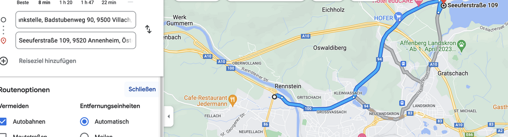 So würde mich das neue Magic Earth führen (auch ohne die Einstellung Autobahn vermeiden)AndiEh hat geschrieben: Do 4. Mai 2023, 21:09Jet Tankstelle Badstubenweg 90, 9500 Villach, Österreich